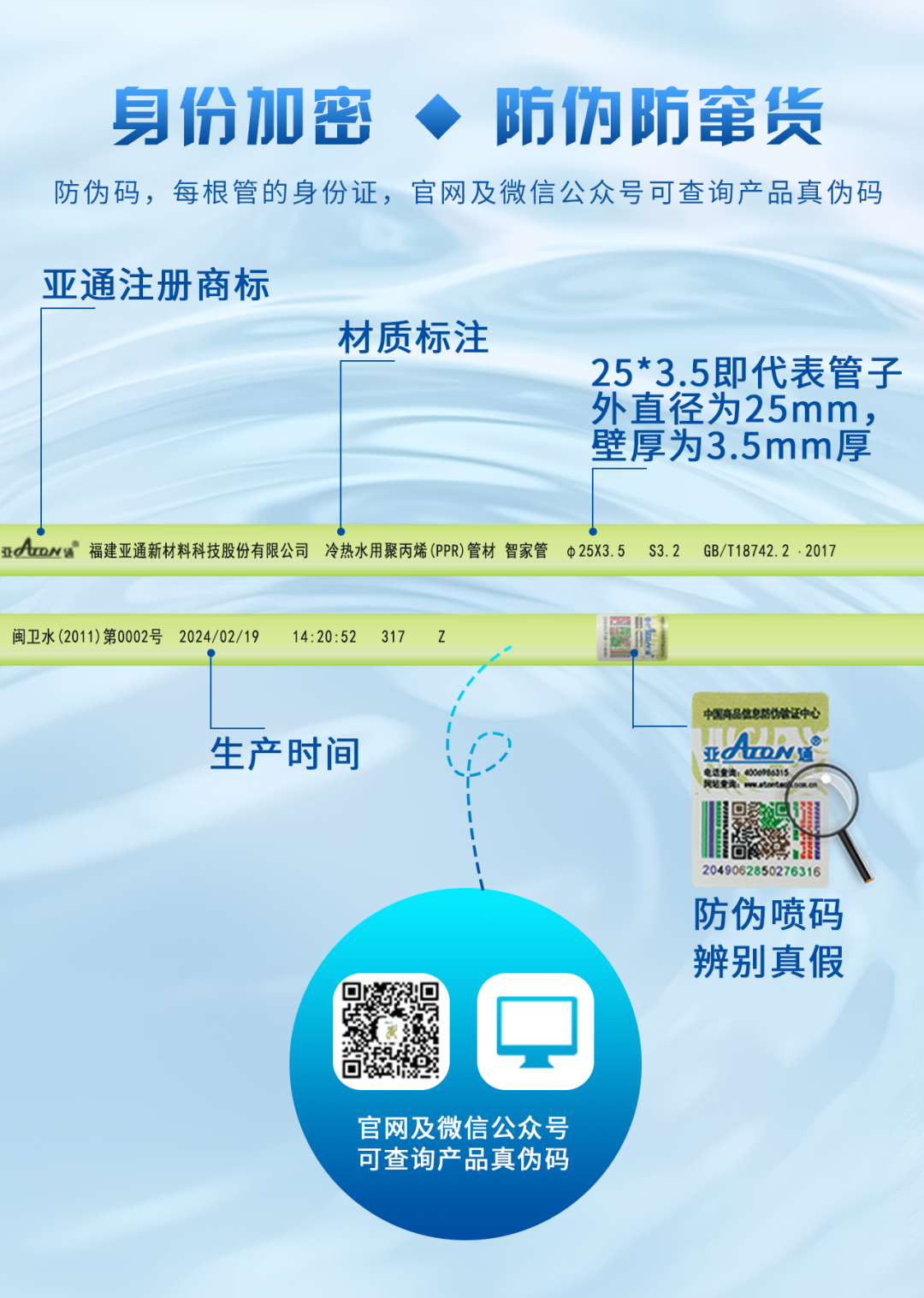 所有管材管件都帶有亞通獨(dú)特的、國內(nèi)最領(lǐng)先的防偽及防竄貨激光二維碼標(biāo)簽,只要通過激光就可查看貨源信息,每根管的身份證,官網(wǎng)及微信公眾號(hào)可查詢產(chǎn)品真?zhèn)未a。杜絕任何假貨,帶給消費(fèi)者不便的困擾。