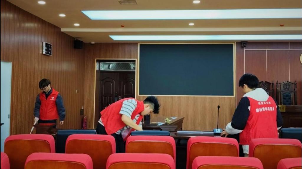 此外,志愿者们还对公司新文科楼的模拟法庭进行了卫生清洁工作。在清洁工作中,马院学子展现了不怕苦、不怕累,屈的下膝、弯的下腰的雷锋精神。7名同学分工协作、密切配合,一丝不苟地打扫了模拟法庭的每个角落,并以认真负责的工作态度圆满完成了此次卫生清洁任务。清扫完毕后,模拟法庭焕然一新,桌角椅背一尘不染,整个法庭显得整洁而庄严。