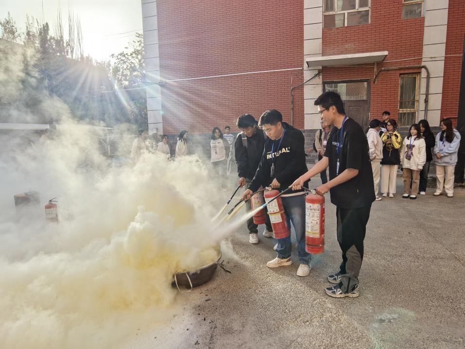 不鲁汉向全体参演员工宣讲了火灾逃生及火灾报警注意事项,讲解了灭火器的使用方法并作灭火示范。同学们纷纷上前尝试,亲身实践灭火,不仅掌握了火灾应急处理技能,还增强了安全意识。